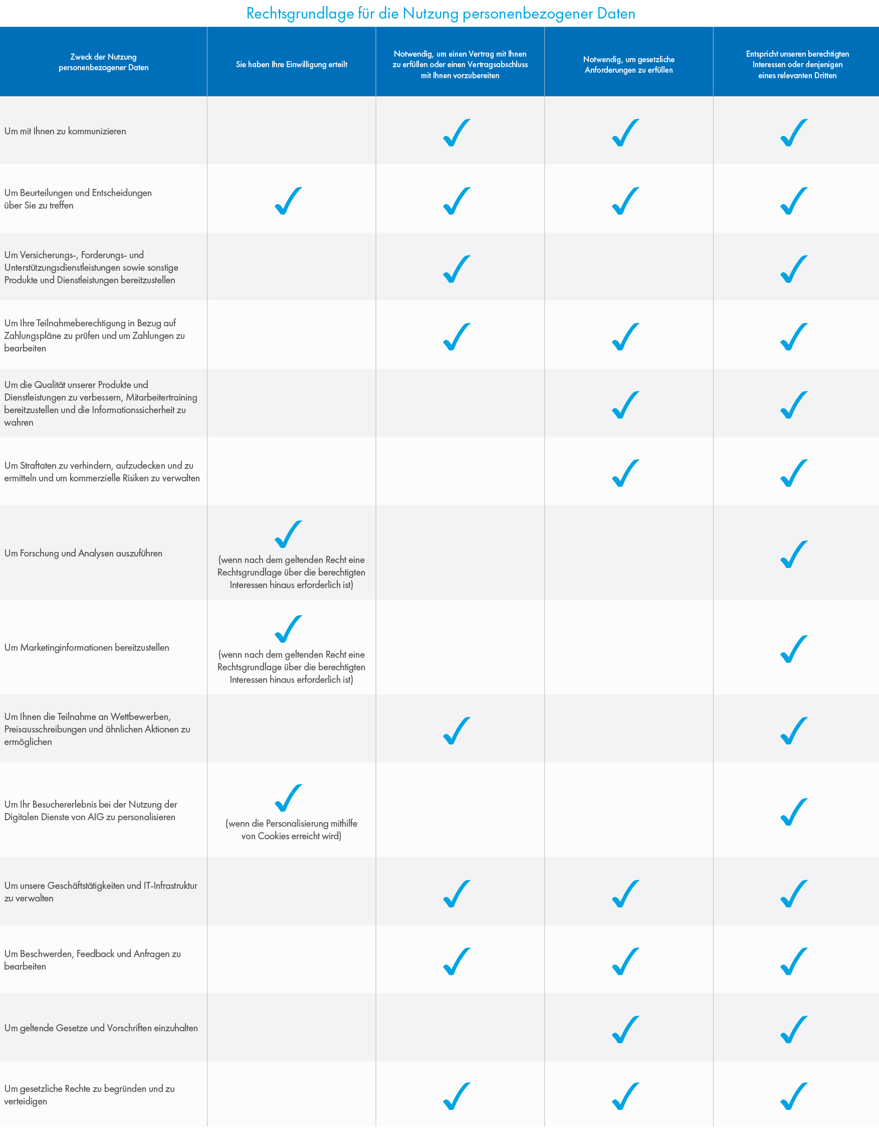 Das Datenschutzrecht soll sicherstellen, dass die Art und Weise, wie personenbezogene Daten verarbeitet werden, gerecht ist. Um das Gesetz einzuhalten, müssen wir Ihnen die juristische Rechtfertigung (manchmal auch als Rechts- oder gesetzliche Grundlage bzw. Rechtsgrund bezeichnet) mitteilen, auf die wir uns bei der Verwendung Ihrer personenbezogenen Daten stützen. Während das Gesetz mehrere juristische Rechtfertigungen vorsieht, werden in der folgenden Tabelle die wichtigsten juristischen Rechtfertigungen beschrieben, die für unsere Zwecke der Verwendung personenbezogener Daten gelten.