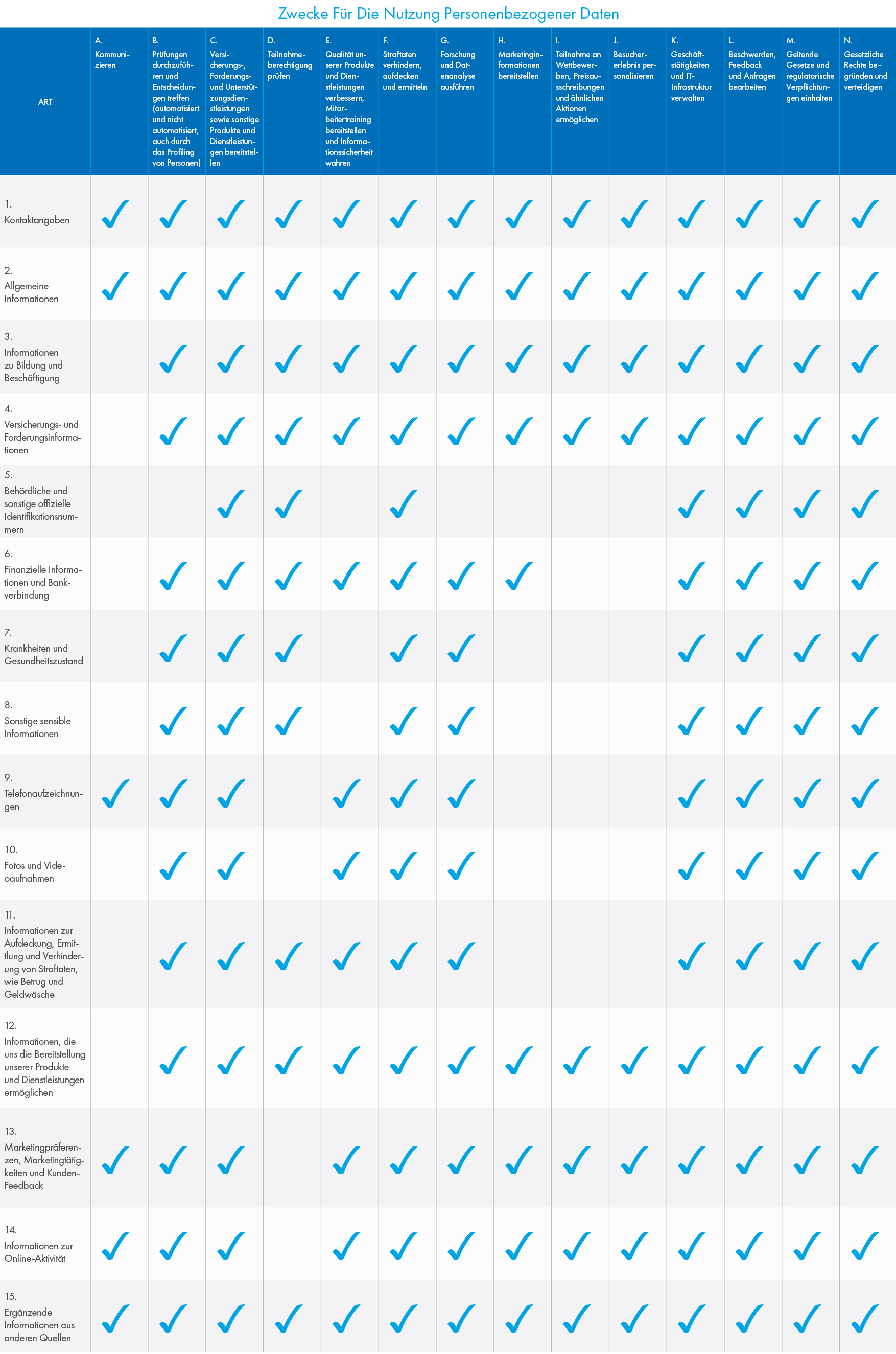 Wir verwenden personenbezogene Daten zur Durchführung unserer Geschäftsaktivitäten. Die Zwecke, für die wir Ihre personenbezogenen Daten verwenden, unterscheiden sich je nach unserer Beziehung, einschließlich der Art der Kommunikation zwischen uns und den von uns bereitgestellten Dienstleistungen. Personenbezogene Daten werden für unterschiedliche Zwecke verwendet, wenn Sie Versicherungsnehmer, Versicherter oder Anspruchsberechtigter im Rahmen einer Versicherungspolice, ein gewerblicher Versicherungsmakler oder ernannter Vertreter, ein Zeuge oder eine andere Person sind, mit der wir eine Beziehung haben.